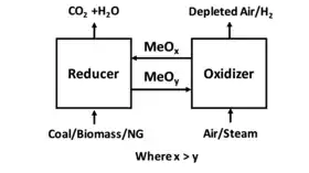 Chemical looping combustion (CLC) uses two or more reactions to perform the oxidation of hydrocarbon-based fuels. In its simplest form, an oxygen-carrying species (normally a metal) is first oxidized in the air forming an oxide. This oxide is then reduced using a hydrocarbon as a reducer in a second reaction. As an example, an iron based system burning pure carbon would involve the two redox reactions: