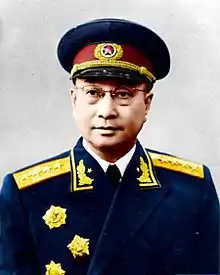 At the request of Chen's longtime friend Hồ Chí Minh, he entered French Indochina to help Võ Nguyên Giáp launch a series of attacks on isolated French bases along the Chinese border in 1950.[34] Back from French Indochina, he left for the Korean War and served as commander and political commissioner of the 3rd Army Group of the People's Volunteer Army.[35] When Commander Peng Dehuai returned to China, Chen temporarily took command. He was awarded the military rank of senior general in September 1955 by Chairman Mao Zedong. His brother-in-law, Tan Zheng, who was married to Chen's sister, Chen Qiuju, was strongly influenced by Chen to join the Communists and became a senior general at the same time.[36]