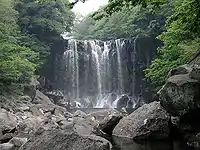 Cheonjeyeon Waterfall is a three-tier waterfall located on Jeju Island.[1] Cold water flows out of the ceiling of a cave to make the waterfall.[1] Between the precipice of the waterfall and the lower clay layer, water springs out.[2] In first cascade, the cliff is 22 m (72 ft) high and the water falls into Cheonjeyeon pond which is 21 m (69 ft) deep.[2] From there, the water goes to the second waterfall and falls 30 m (98 ft) and continues to the third waterfall.[1][2] Eventually, the water reaches the ocean.[1] Cheonjeyeon means Pond of the Emperor of Heaven.[1][3] According to Korean legend, seven nymphs would descend from the heavens at night and bathe in the waterfall's pond.[3] The falls are a popular tourist attraction on Jeju-do.[4]