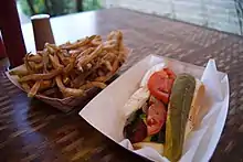 | Main ingredients | Sausage, poppy seed bun, yellow mustard, white onion, sweet "neon green" pickle relish, pickled sport peppers (a variety of Capsicum annuum), tomatoes, kosher dill pickle spear, celery salt[1][2] |