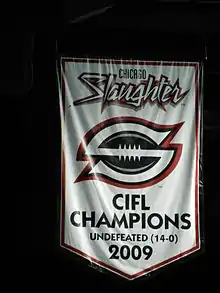 In 2009, the Slaughter signed seven players from the Chicago Rush when the Arena Football League cancelled the 2009 season, including Donovan Morgan, Reggie Gray, Bobby Sippio, and eventual CIFL league MVP Russ Michna.[3] The Chicago Slaughter averaged over 65 points per game and outscored their opponents by almost an average of 30 points per game, going 14-0 for the season. On June 27, 2009, the Slaughter won the CIFL championship.[4]