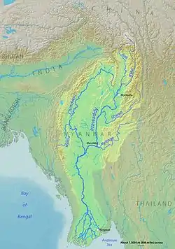 2. "Chindwin River | river, Myanmar | Britannica". www.britannica.com. Retrieved 2023-03-25. Called Ningthi by the Manipuris of India, it drains northwest through the Hukawng valley and then begins its 520-mile (840-kilometre) main course.