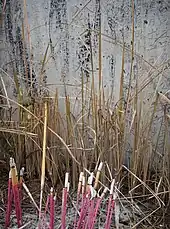 The Northern and Southern dynasties book Jingchu Suishiji described the practice of firing bamboo in the early morning of New Year's Day,[30] which became a New Year tradition of the ancient Chinese. Poet and chancellor of the Tang dynasty Lai Gu also described this tradition in his poem Early Spring (早春): "新曆才将半纸开,小亭猶聚爆竿灰", meaning "Another new year just started as a half opening paper, and the family gathered around the dust of exploded bamboo pole".[31] The practice was used by ancient Chinese people to scare away evil spirits, since firing bamboo would noisily crack or explode the hard plant.