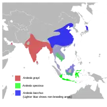 | Global range of A. bacchus, compared to its presumed closest relatives Ardeola bacchus Breeding range Ardeola bacchus Non-breeding range | |