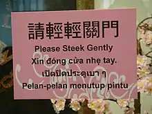Chinglish is slang for spoken or written English language that is either influenced by a Chinese language, or is poorly translated.[1] In Hong Kong, Macau, Guangdong and Guangxi, the term "Chinglish" refers mainly to Cantonese-influenced English. This term is commonly applied to ungrammatical or nonsensical English in Chinese contexts, and may have pejorative or deprecating connotations.[2] Other terms used to describe the phenomenon include "Chinese English", "China English", "Engrish" and "Sinicized English".[3] The degree to which a Chinese variety of English exists or can be considered legitimate is still up for debate.[4]