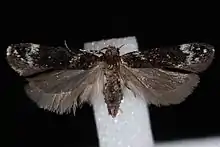 The wingspan is about 15 mm. The forewings are white, thickly suffused with fuscous, obliterating the white ground-color except on the apical third of the wing, which is pure white. Near base is an ill-defined oblique costal streak with only a few dark scales therefore appearing whitish against the darker surrounding parts. The hindwings are light fuscous.[4]