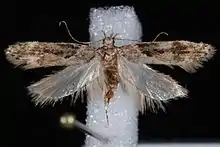 The forewings are pale yellowish with a dark brown spot along the costa. There is a blackish-brown dot at the angle on the fold and another above it. The hindwings are shining pale grey.[2]