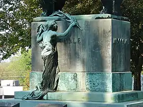 The cemetery includes impressive monuments by Alexander Stirling Calder and Paul de Vigne. Many of the monuments reflect attitudes about death and mourning from the Victorian Era. Some of the more memorable grave markers include life-size stone statues, a ship's anchor, a six-ton granite ball, a baby's cradle, the sleeping dog statue guarding the Dimick children, and the mourning woman at the Cable monument.[3]