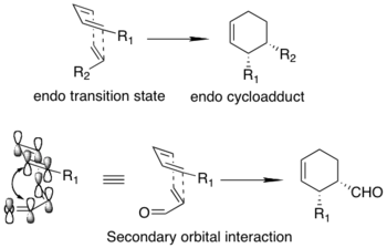 Diels-Alder reactions can lead to the formation of a variety of structural isomers and stereoisomers. Molecular orbital theory considers that the endo transition state, instead of the exo transition state, is favored (endo addition rule). Also, augmented secondary orbital interactions have been postulated as the source of enhanced endo diastereoselection.