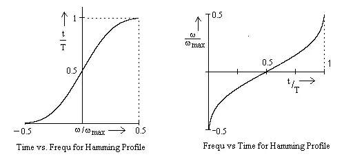 Now because the principle of stationary phase shows that there is a direct relationship between elapsed time and the instantaneous signal delay then, for the Hamming window, t/T can be related to ω/ωmax by