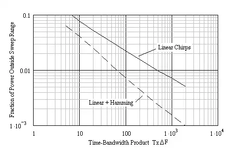 In the case of a non-linear chirp, or a linear chirp shaped by amplitude weighting, the fraction of power outside ΔF is even lower, as is shown on the graph, where the dashed line is for spectra with Hamming profiles.