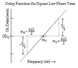 Consequently, for frequencies within the sweep range of the chirp, it is the square-law phase term Φ1(ω) and its group delay function ( = -dΦ1/d(ω) ) that are of most interest. There is a plot of the group delay shown below. Both this function and the phase Φ1(ω) are independent of the value of the time-bandwidth product. As expected, the group delay is a linear function with a duration T secs, over a frequency sweep of ΔΩ rads.
