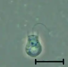 Choanoflagellates grow vegetatively, with multiple species undergoing longitudinal fission;[11] however, the reproductive life cycle of choanoflagellates remains to be elucidated. A paper released in August 2017 showed that environmental changes, including the presence of certain bacteria, trigger the swarming and subsequent sexual reproduction of choanoflagellates.[8] The ploidy level is unknown;[23] however, the discovery of both retrotransposons and key genes involved in meiosis[24] previously suggested that they used sexual reproduction as part of their life cycle. Some choanoflagellates can undergo encystment, which involves the retraction of the flagellum and collar and encasement in an electron dense fibrillar wall. On transfer to fresh media, excystment occurs; though it remains to be directly observed.[25]