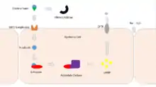 Cholera toxin acts by the following mechanism: First, the B subunit ring of the cholera toxin binds to GM1 gangliosides on the surface of target cells. If a cell lacks GM1, the toxin most likely binds to other types of glycans, such as Lewis Y and Lewis X, attached to proteins instead of lipids.[7][8][9] Once bound, the entire toxin complex is endocytosed by the cell and the reduction of a disulfide bridge releases the cholera toxin A1 (CTA1) chain. The endosome is moved to the Golgi apparatus, where the A1 protein is recognized by the endoplasmic reticulum (ER) chaperone, protein disulfide isomerase. The A1 chain is then unfolded and delivered to the membrane, where Ero1 triggers the release of the A1 protein by oxidation of protein disulfide isomerase complex.[10] As the A1 protein moves from the ER into the cytoplasm by the Sec61 channel, it refolds and avoids deactivation as a result of ubiquitination.