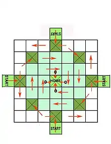 Depending on the number rolled, the player can move one (or more) of their pawns that many number of squares on the board. Each player has a fixed path to move pawns, which is in an anti-clockwise direction. The path for Player 1 is given in the example diagram. Each player's piece must completely traverse the outer squares before moving into the inner squares.