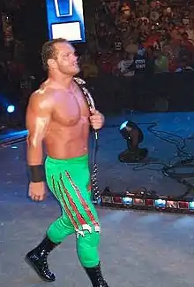 The Benoit-Edge feud ended at New Year's Revolution in an Elimination Chamber match, which both men lost.[67] The feud stopped abruptly, as Edge feuded with Shawn Michaels, and Benoit entered the Royal Rumble, lasting longer than any competitor before being eliminated by Ric Flair.[68] The two then continued to have matches in the following weeks until the two of them, Chris Jericho, Shelton Benjamin, Kane, and Christian were placed in the Money in the Bank ladder match at WrestleMania 21. Edge won the match by knocking Benoit off of the ladder by smashing his arm with a chair.[68] The feud finally culminated in a Last Man Standing match at Backlash, which Edge won with a brick shot to the back of Benoit's head.[69]
