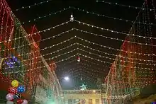 Christmas lights and banners may be hung along streets, music played from speakers, and Christmas trees placed in prominent places.[36] It is common in many parts of the world for town squares and consumer shopping areas to sponsor and display decorations. Rolls of brightly colored paper with secular or religious Christmas motifs are manufactured for the purpose of wrapping gifts. In some countries, Christmas decorations are traditionally taken down on Twelfth Night.