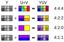 Chroma subsampling is the practice of encoding images by implementing less resolution for chroma information than for luma information, taking advantage of the human visual system's lower acuity for color differences than for luminance.[1]