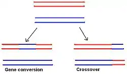 The specific causes of non-homologous crossover events are unknown, but several influential factors are known to increase the likelihood of an unequal crossover. One common vector leading to unbalanced recombination is the repair of double-strand breaks (DSBs).[30] DSBs are often repaired using homology directed repair, a process which involves invasion of a template strand by the DSB strand (see figure below). Nearby homologous regions of the template strand are often used for repair, which can give rise to either insertions or deletions in the genome if a non-homologous but complementary part of the template strand is used.[30] Sequence similarity is a major player in crossover – crossover events are more likely to occur in long regions of close identity on a gene.[31] This means that any section of the genome with long sections of repetitive DNA is prone to crossover events.