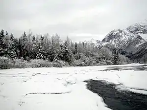 A non-profit organization in association with the park operates the Eagle River Nature Center which exhibits interpretive information on wildlife and geological features.[1] The basin of the Eagle River can be accessed by the nearby Albert Loop Trail which passes through three miles (five kilometers) of mixed forests and leads to a river fed by glaciers hidden in the surrounding mountains.[1][16] At those times in the fall when the park's ursine residents are using the area for their fishing purposes, the trail is closed so as to lessen bear-human interactions.[16] In addition, the Rodak Nature Trail leads to a beaver and salmon viewing deck.[16] From the trail red salmon (Oncorhynchus nerka) and silver salmon (Oncorhynchus kisutch) can be seen as they spawn, especially in August.[17] Brown bears (Ursus arctos) and grizzly bears (Ursus arctos ssp.) often feed on salmon in shallow water between the beaver dams.[17] Hundreds of black bears (Ursus americanus) likewise live in the park.[1] Area streams are excellent for birding as well.[17] The American dipper (Cinclus mexicanus) can be seen during the winter months, which birders will also find a successful time to listen for the great horned owl (Bubo virginianus) and boreal owl (Aegolius funereus).[17] Visitors can rent yurts and cabins along the Eagle River in order to spend time out exploring the scenery and wildlife in the area.[18] Camping is available at the Eagle River Campground.[1]