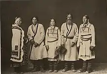 Physical anthropologists using the racial frameworks of the early 20th century saw the Chuvash as a mixed Finno-Ugric and Turkic people.[47][42] An autosomal analysis (2015) detected an indication of Oghur and possibly Bulgar ancestry in modern Chuvash. These Oghur and Bulgar tribes brought the Chuvash language with them.[48] Another study found some Finno-Ugric components in Chuvash people.[49] In 2017 a full genome study found Chuvash largely show a Finno-Ugric genetic component despite having a common Turkic component with Bashkir and Tatar peoples. This study supported elite domination hypothesis among Volga Turkic populations.[50]