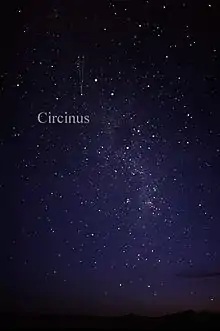 Bordered by Centaurus, Musca, Apus, Triangulum Australe, Norma and Lupus, Circinus lies adjacent to the Alpha and Beta Centauri stars. As it is at declination −50° to −70°, the whole constellation is only visible south of latitude 30° N. The official constellation boundaries, as set by Belgian astronomer Eugène Delporte in 1930, are defined by a polygon of 14 segments. In the equatorial coordinate system, the right ascension coordinates of these borders lie between 13h 38.4m and 15h 30.2m , and the declination coordinates are between −55.43° and −70.62°.[1] Circinus culminates each year at 9 p.m. on 30 July.[4] The recommended three-letter abbreviation for the constellation, as adopted by the International Astronomical Union in 1922, is "Cir".[5]