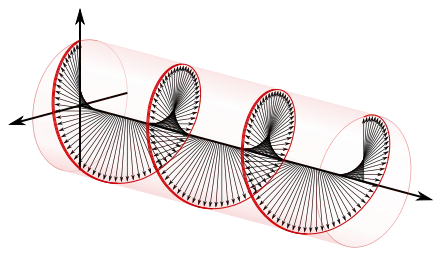 The electric field vectors of a traveling circularly polarized electromagnetic wave. This wave is right-circularly-polarized, since the direction of rotation of the vector is related by the right-hand rule to the direction the wave is moving; or left-circularly-polarized according to alternative convention.