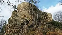 The castle next passed into Bohemian ownership.[1][2][3] As already mentioned, sources are conflicting. (1) According to one account, ownership of the castle passed by prior agreement after the deaths of Nikel and of Agnes to new but unidentified owners, who enlarged it. In 1428, the castle was occupied by the Hussites during their unsuccessful struggle for religious freedom (1419-1434). It was subsequently occupied by robber knights. In 1484, they were expelled and the castle was destroyed. In the 16th century, ownership passed to the wealthy Czettritz family. During the Thirty Years War (1618-1648), the castle was burnt by Swedish troops during their intervention in that conflict.[1] (2) According to another account, ownership passed by unspecified means. The castle was successively occupied by various families; namely, Zeispercek, A. von Grunau and Czettritz, and was further enlarged.[3] (3) According to yet another account, in 1408 the castle was bought by Alexander von Grunau, and in 1429 by Ulrich von Seydlitz. In 1466, the castle was severely damaged by Hussite troops.[Note 1] It is conjectured that it was later repaired and improved. The castle was damaged again by Swedish troops during the Thirty Years War. It was subsequently (i.e. not earlier than the 17th century) taken over by the Czettritz family.[2] (4) According to another account still, after Agnes' death the castle became the property of the king of Bohemia, who passed it in succession to two knightly families, von Grunau and von Czettritz. The castle was damaged during the Hussite Wars. It was subsequently repaired and strengthened. In 1643, Swedish troops destroyed it. After the end of the Thirty Years War, the Czettritz family reclaimed the castle, but did not repair it. Stones were removed and used in other buildings.[5]