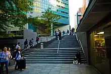The plaza has an area of 6,000 sq ft (560 m2).[60] Its presence allowed the tower to be designed with a maximum floor area ratio of 18:1, higher than the 15:1 ratio specified for the area.[27] The plaza is accessed by a set of stairs extending northeast from the corner of Lexington Avenue and 53rd Street.[54][61] On the south side of the plaza is an entrance to the Lexington Avenue/51st Street subway station.[62][63] This subway entrance replaces two staircases from the street, which were demolished to make way for Citicorp Center.[54] The north side of the plaza contains the entrance to St. Peter's Church and the east side contains an entrance to the lower lobby.[64] During the plaza's construction, the developers collaborated with the numerous public agencies with a stake in the project, including the Metropolitan Transportation Authority, which operated the subway station.[34]