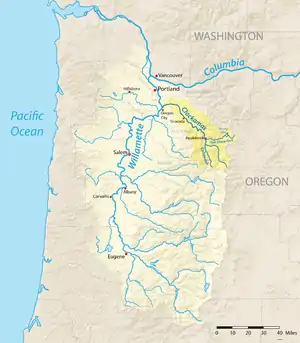 ![]() Map showing the Clackamas River highlighted within the Willamette River watershed | |