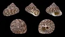 The height of the shell attains 11 mm, its diameter 14 mm. The umbilicate shell has a depressed-globose conic shape. It is, polished, shining, blackish, olive or purplish brown, unicolored, dotted or tessellated with white, often with short flames of white beneath the sutures and always more or less marked with white around the umbilicus . The spire is conical. The sutures are simple and impressed. The 5 to 6 whorls are convex. The upper surface is marked with obsolete, frequently almost imperceptible line, the interstices between them finely spirally striate. The base of the shell is smoother, and lightly concentrically marked around the center. The aperture is rounded. The outer and basal margins are crenulated within. The columella bears a small tooth above and below, concave between them, deeply entering the umbilicus, but inserted on its edge. The umbilicus is rather deep, smooth within and bordered by an irregularly crenulated rib.