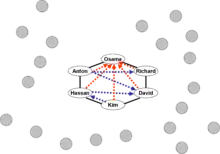 In the illustration of the core shown here, each member knows how to reach two other members, and also knows the member(s) he or she considers her or his ideological superior. Solid lines show basic communication, dotted red arrows show the first level of ideological respect, and dotted blue arrows show a second level of ideological respect.