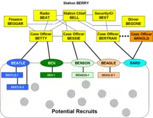 Station BERRY operates, on behalf of country B, in target country BE. The station has three case officers and several support officers. Case officer BETTY supervises the local agents BEN and BEATLE. Case officer BESSIE supervises BENSON and BEAGLE.