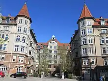 Classensgård (Np. 17-19), located opposite Kastelsvej, is a high-end apartment building. The facade surrounds a small cul-de-sac, a solution chosen to make the most of the site without employment of the traditional courtyard buildings. The building features two corner towers and a small bell tower as well as a clock gface at the bottom of the cul-de-sac. The building is from 1909.