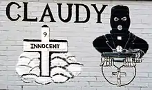 A 2004 loyalist mural on Lower Newtownards Road in Belfast making reference to the bombing. It shows a priest wearing a balaclava and holding a bomb and rosary beads.[14]