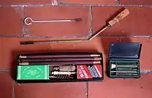 A cleaning rod is a firearm maintenance tool that can be used to clean the inside (bore) of a gun's barrel, and is made in different sizes for use on different barrel lengths, calibers and gauges. It is a sturdy, long, thin, straight rod typically made of metal, rigid plastic or carbon fiber, and usually has a handle at one end for gripping and threadings at the other end for attaching cleaning accessories. It is used to push brushes, mops and cotton patches through the bore to deliver solvents and scrub away foulings, or to physically remove any obstructing objects such as a squib load.
