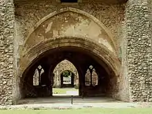 It is suggested from the heraldry used in the tiled floors of the refectory that it was finished at the end of the thirteenth century.[5] The encaustic tiles, which are 23 centimetres (9.1 in) square, include the arms of Henry III, Richard, 1st Earl of Cornwall and the Clare family.[8] It is believed they were produced to celebrate the marriage of Edmund, 2nd Earl of Cornwall and Margaret de Clare in 1272.[9] The final part to be finished was the small west range, which was used for storage and quarters for the lay brothers. East of the core buildings, and linked to them, was a second cloister around which was the monastic infirmary.[10]