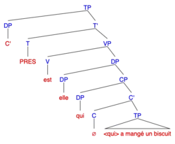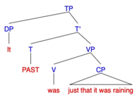 In English, it-clefts consist of the pronoun it, followed by a form of the verb to be, a cleft constituent, and a complementizer, which introduces a relative clause that is attributed to the cleft phrase.[1] It-clefts introduce two meanings parts: (1) a presupposition that the property in the clause following the complementiser holds of some entity; and (ii) an assertion that this property holds of the entity denoted by the cleft constituent.[1]