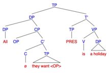 In English, all-cleft sentences are related to pseudo-clefts in which they are constructed with the subject of the sentence embedded in the phrase and expressed with the verb "to be".[7] Where pseudo-clefts begin with a wh-phrase (what, where, who), all-clefts begin with the use of the word "all".[7]
