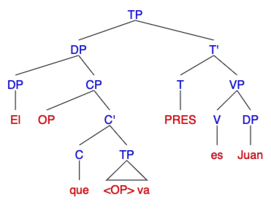 There exist several constructions which play the role of cleft sentences. A very common resource is the adding of "es que" (time-dependent). Similar to English cleft sentences, time-dependent cleft constructions in Spanish also share a temporal relationship between the verb of the relative clause and the copula.[17]