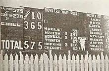 - See scoring (cricket) for an explanation of cricket score formats. This score and all others in the article follow the Australian format of wickets fallen followed by runs made.