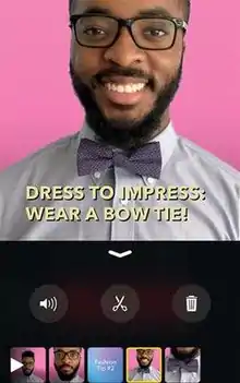 After launching of the app, the user sees the view of the front-facing camera.[6] The app allows the user to create a new clip by tapping on a red record button,[7] or use photos or videos from the device's photo library.[8] Once a clip is recorded, it can be added to a project timeline shown at the bottom of the screen.[9] The user can share their project on social media platforms.[2][8] The user can also add filters and effects to the project.[7][10] "Live Titles" (available in several styles[11]) can also be created by dictating to the device.[11][12]