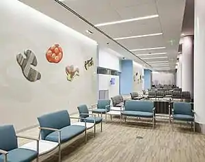 Cloud Busting, the ceramic mural artwork by Malcolm Mobutu Smith, is inspired by the common pastime of identifying shapes and forms among the clouds.[1] In the same way imaginative scenes and stories are derived from undetermined clouds, Cloud Busting offers shapes and forms that seem to float along the wall, awaiting interpretation. This work transforms the waiting room into a colorful, lighthearted, and fun space where visitors can engage with the inspiring and intriguing work.[1] Smith describes Cloud Busting: