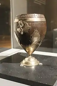 The process of elaboration was carried out in two phases. First, the coconut was curved and decorated with metal, shell and semiprecious stone applications. Later, the object was mounted in silver, forming a pedestal where the name of the owner, the year, and the place of the manufacturer was written. These objects were manufactured in the Americas and different places of Europe, including Germany, Spain and France.[1][3]