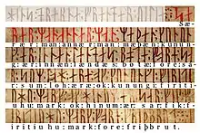 The Codex Runicus is a codex of 202 pages written in medieval runes around the year 1300 which includes the oldest preserved Nordic provincial law, Scanian Law (Skånske lov) pertaining to the Danish land Scania (Skåneland). Codex Runicus is one of the few runic texts found on parchment. The manuscript's initials are painted various colors and the rubrics are red. Each rune corresponds to a letter of the Latin alphabet.