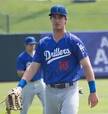 The Los Angeles Dodgers selected Bellinger in the fourth round, 124th overall, of the 2013 MLB Draft. At the time, he had committed to play college baseball for the Oregon Ducks.[8] Bellinger chose to forego his commitment to Oregon in order to sign with the Dodgers for a signing bonus of $700,000, approximately $300,000 more than what was recommended for a fourth-round draft pick.[9][10] He spent the season with the Rookie League AZL Dodgers, batting .210 in 162 at-bats, with one home run, 30 RBIs, and 25 runs scored.[11] He showed some difficulties with plate discipline, striking out 46 times in 47 games, but showed potential by drawing 31 walks and recording 16 extra-base hits.[12] He continued in Rookie ball the following season with the Ogden Raptors, batting .328 with 34 RBIs in 46 Pioneer League games.[13]