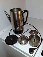 A coffee percolator is a type of pot used for the brewing of coffee by continually cycling the boiling or nearly boiling brew through the grounds using gravity until the required strength is reached.[1]