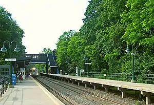 MTA control of passenger service continued through the period when it was taken over by Conrail in 1976, and then by Metro-North Railroad in 1983. Cold Spring station was one of the last stations within the system to be rebuilt and relocated with high-level platforms, a pedestrian bridge, and elevators. The former station house is within the boundaries of the Cold Spring Historic District.[4] The current Cold Spring station is located slightly south of the old one, still standing at the foot of Cold Spring's Main Street. Walkways on both sides of the tracks connect the old and new station, and the pedestrian tunnel built by New York Central Railroad is still in use today by both commuters and local residents.[5][6][7]