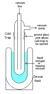 In vacuum applications, a cold trap is a device that condenses all vapors except the permanent gases into a liquid or solid.[2] The most common objective is to prevent vapors being evacuated from an experiment from entering a vacuum pump where they would condense and contaminate it. Particularly large cold traps are necessary when removing large amounts of liquid as in freeze drying.