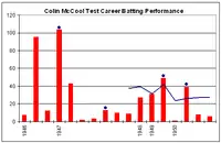 India toured Australia for the first time in 1947–48. McCool played in three Tests without much success, scoring only 46 runs and taking only four wickets.[21][22] Nevertheless, he was selected as part of Australian team to tour England in 1948 that would be known as the Invincibles. He took 57 wickets on the tour but bowling for long periods caused him to continually tear a callus on his third finger, used to impart spin on the ball.[1] As a result, his captain, Don Bradman, felt compelled to leave him out of the Test matches, feeling that his finger would not be able to handle the necessarily long bowling spells.[23] This decision was aided by the then existing rule allowing a new ball to be used every 55 overs, allowing Bradman to use his fast bowlers more often. For the rest of his career, McCool was troubled by the skin rubbing off his spinning finger.[1] McCool and his fellow fringe members of the squad, Ron Hamence and Doug Ring, would refer themselves as the "ground-staff" as it was unlikely that the tour selectors would include them in the Test team that tour.[24][25] The cricket writer Alan Gibson, who knew McCool well in his later cricket career at Somerset, wrote that the omission "distressed him greatly at the time, though he could be philosophical enough about it later".[26]